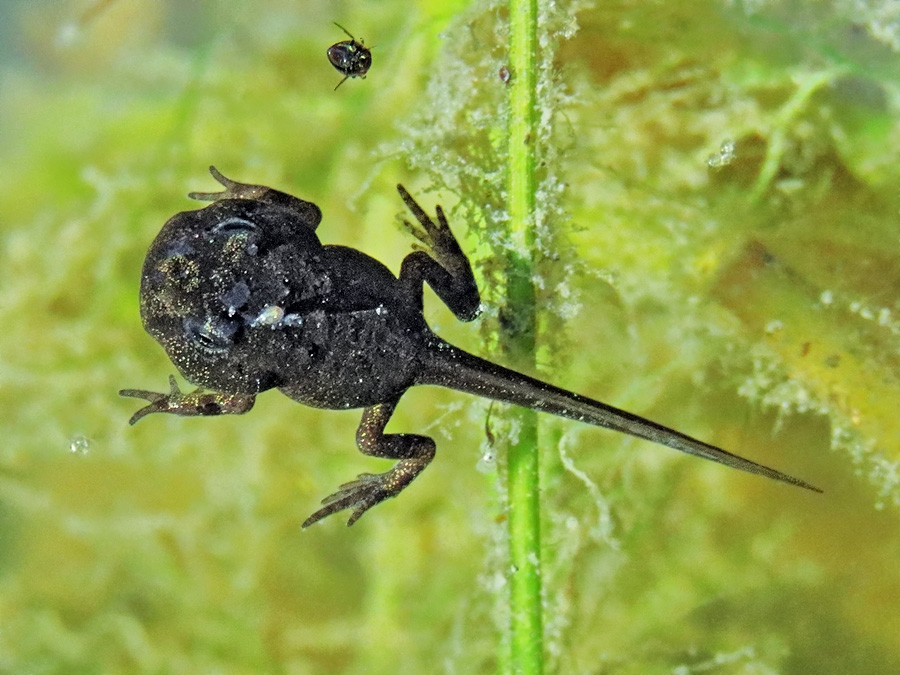 Вот, среди головастиков замечаю одного, уже начавшего своё превращение в лягушонка: у него ещё имеется длинный