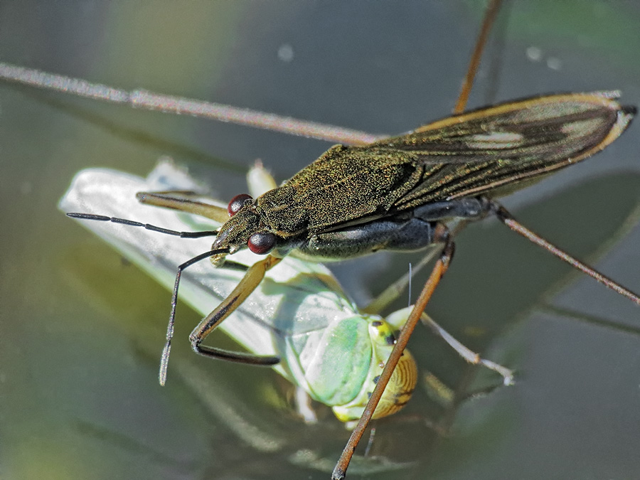 На этом снимке одна из водомерок, предположительно, Gerris lacustris, поедает случайно упавшую в воду цикадку зелёную (Cicadella viridis).
