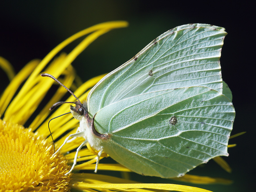 Комментарий. Бабочка лимонница (Gonepteryx rhamni) из семейства белянок (Pieridae) на соцветии девясила высокого (Inula helenium), на клумбе у дома.