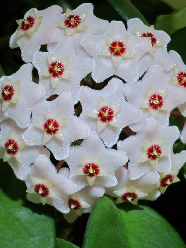 Так цветёт хойя (Hoya carnosa), называемая за свои гладкие, блестящие листья также восковником или восковым плющом.