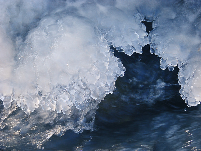 Остались лишь небольшие купели с бурлящей водой - там, где течение наиболее быстрое. Здесь вода и мороз создали удивительные ледяные скульптуры.