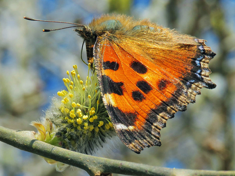 Бабочка-крапивница (Aglais urticae L.), проснувшаяся после долгой зимовки (голодная и несколько потрёпанная), питается пыльцой