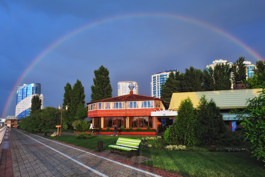 Тёплый золотистый вечерний свет залил Кубанскую набережную, засияла алмазами дождевых капель листва, среди которой
