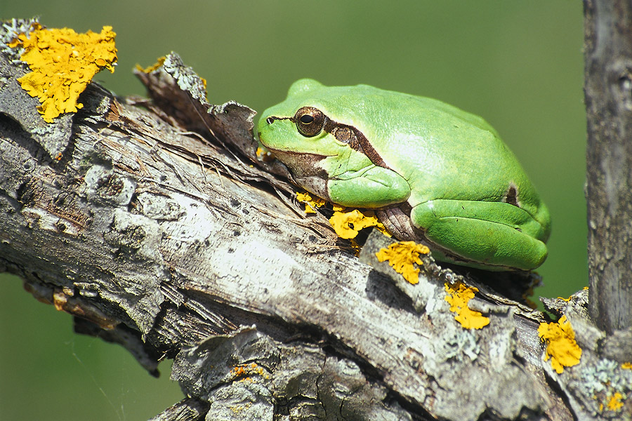 Комментарий. Маленькая ярко-салатовая квакша удобно устроилась на сухой ветке, поросшей ярко-оранжевыми лишайниками, у самого берега глубокой канавы с водой. День выдался необычайно жарким, и лягушенция замерла в необычной позе, подложив под себя лапки для экономии драгоценной влаги. Впрочем, она не рисковала перегреться, ведь после полуденного зноя в любой момент можно было принять прохладную ванну...