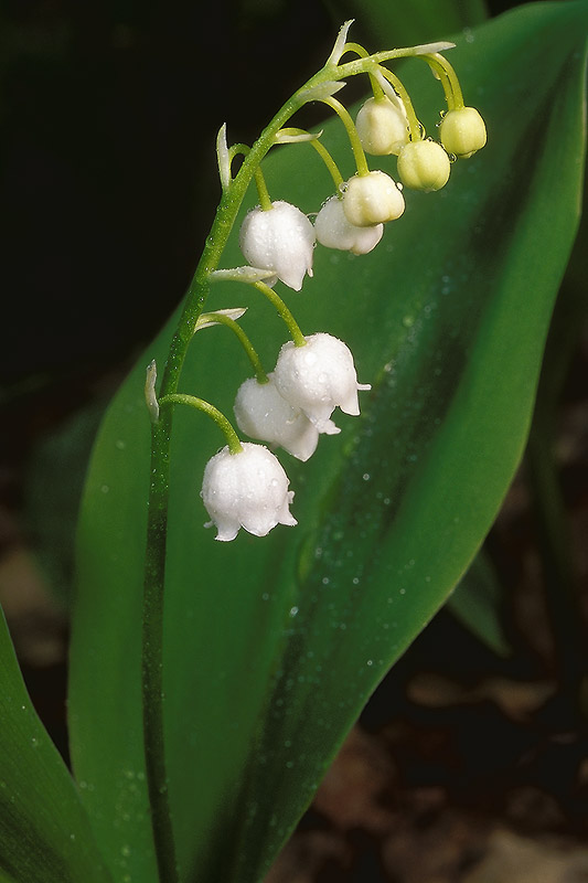 покрытые мельчайшими капельками моросящего дождика, цветы ландыша блестят словно жемчужины в тенистом