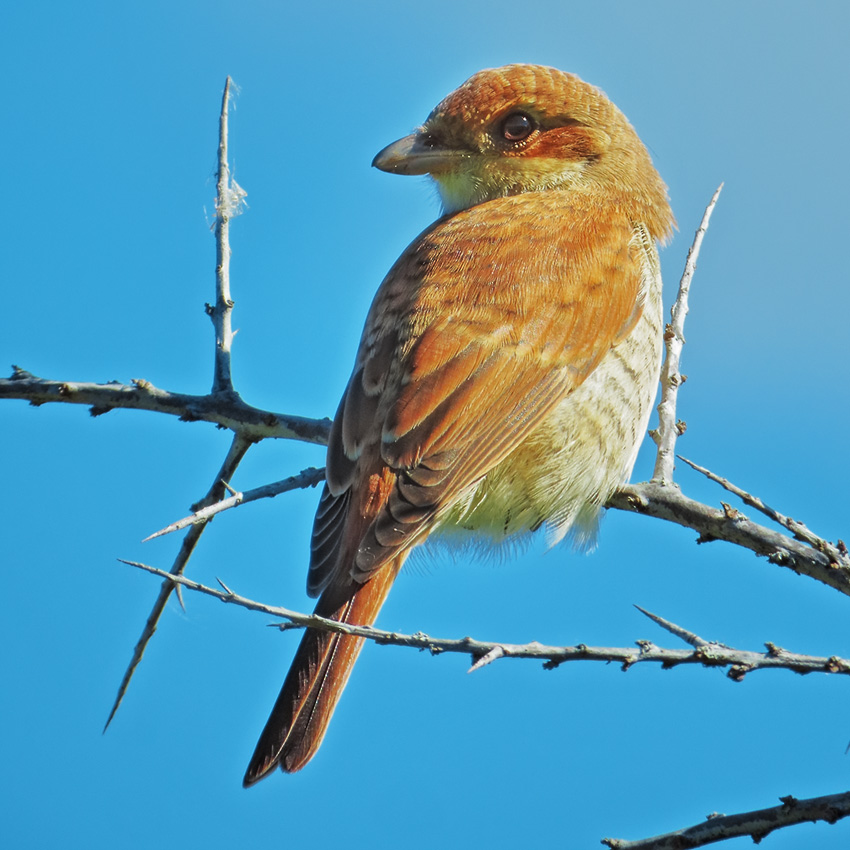 Встреченная мною парочка жуланов (Lanius collurio) беззаботно сидела на колючих кустах облепихи. Едва мне удалось сделать
