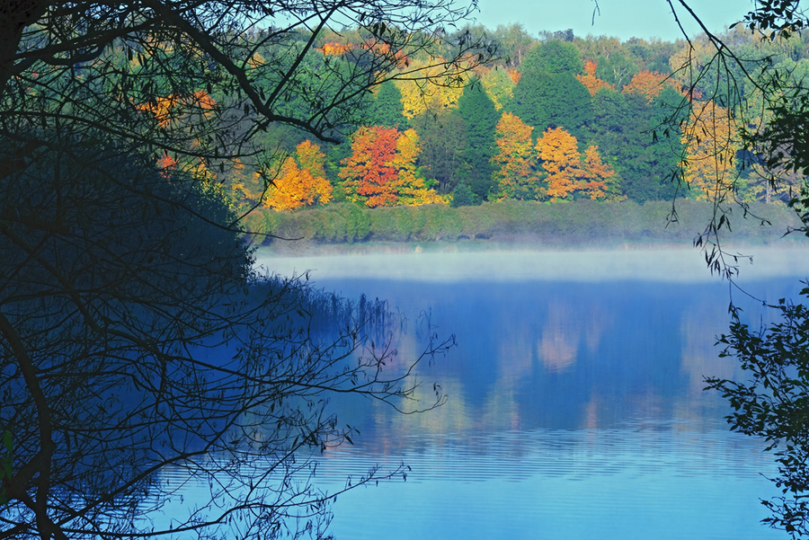 противоположный западный берег, где среди зелени берёз и сосен уже вспыхнули яркими оранжевыми огнями листья клёнов.