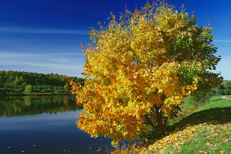 лучи дарят листве яркую радугу красок на фоне тёмного зеркала вод и глубокого, пронзительно синего неба.