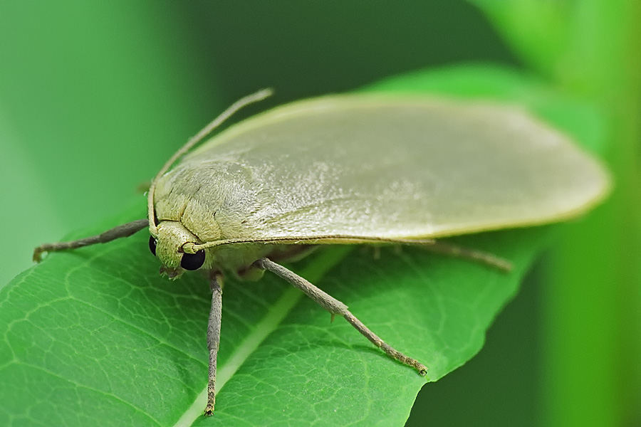 Бабочка лишайница сероватая (Eilema griseola) из семейства Arctiidae или Медведицы у обочины лесной дороги