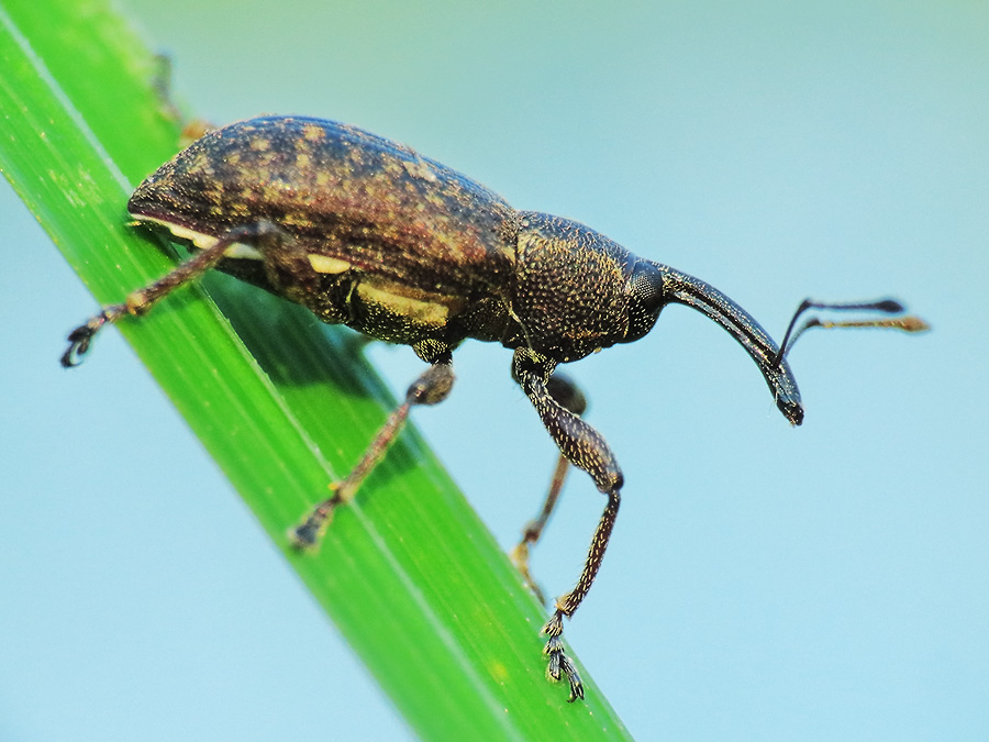 Комментарий. Жук-долгоносик Notaris scirpi из семейства брахицериды (Brachyceridae) на травинке у берега Лебедянского пруда.