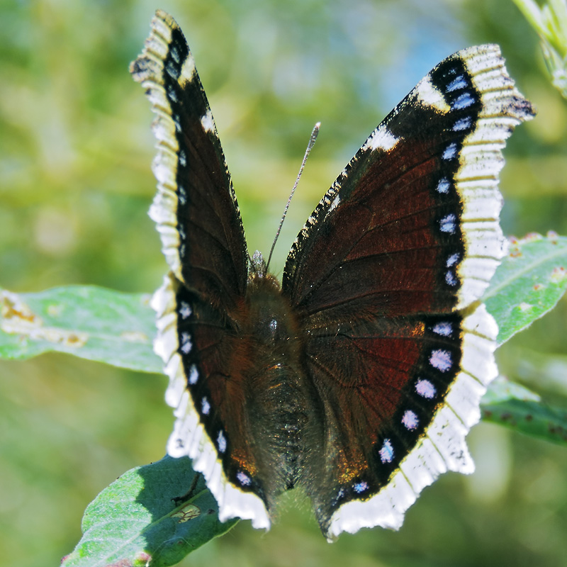 Комментарий. Траурница (Nymphalis antiopa) - одна из самых крупных и необычных бабочек в наших краях. Бывшая некогда весьма распространённой на территории Европы, ныне становится она всё более редкой - численность этого вида внезапно и резко уменьшилась после Второй мировой войны по неизвестным причинам.