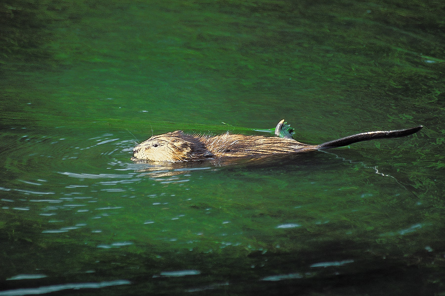 Комментарий. Ондатра (Ondatra zibethica), которую в просторечии именуют водяной крысой, на самом деле относится к группе полёвок. Это симпатичное животное было завезено из Северной Америки и ныне обитает практически везде, где есть водоёмы с богатой растительностью. Много ондатр в Подмосковье, но истинным сюрпризом для меня стало то, что довольно большое семейство этих водных грызунов живёт буквально рядом с нашим домом в Измайловском парке! Местная жительница, наблюдавшая как я фотографирую, рассказала мне, что знает всю семью буквально в лицо, а именно эту ондатру, что на снимке, называет Мамочкой. Серьёзное беспокойство за судьбу зверьков вызывает близость весьма агрессивных собак, да и люди часто не лучше. Но ондатры как-то приспособились. Нет-нет, да и увидишь, прогуливаясь по Серебрянке, как плещется в её малахитовых водах кто-то длиннохвостый и пушистый...
