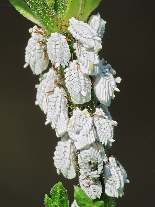 группами, прицепившись ножками к стеблю и погрузив в него хоботок. Кажется, что они состоят из чистого, белоснежного мела,