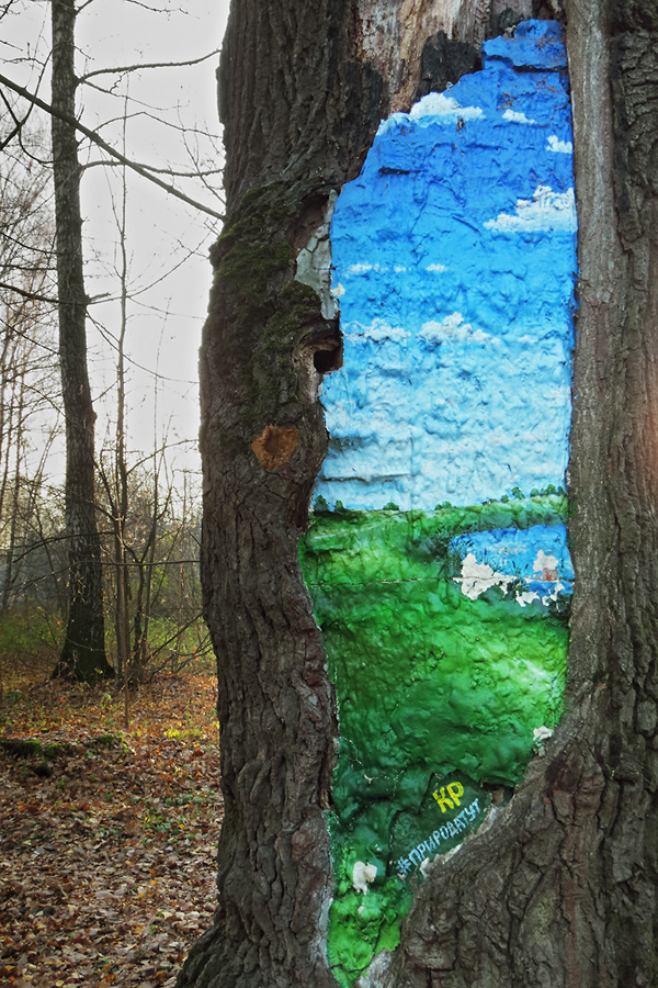 Комментарий. Ещё один старинный дуб из Терлецкого парка, огромное дупло в котором было заполнено бетоном. Трудно изобразить что-либо на столь неровной поверхности, но воображение художника способно творить чудеса: вот перед нами родные российские просторы - бескрайние травянистые луга, зеркало пруда, обрамлённое камышами и синее небо с бегущими по нему облачками...