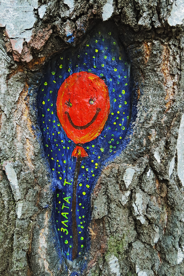 В синее небо, полное звёзд, взлетает ярко-красный воздушный шарик с широкой, по-детски наивной улыбкой.