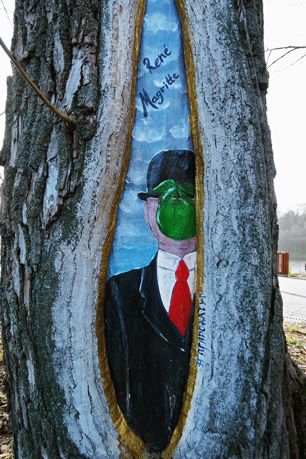 Переизображение картины Рене Магритта "Сын человеческий" неизвестным художником на берегу одного из Терлецких прудов.