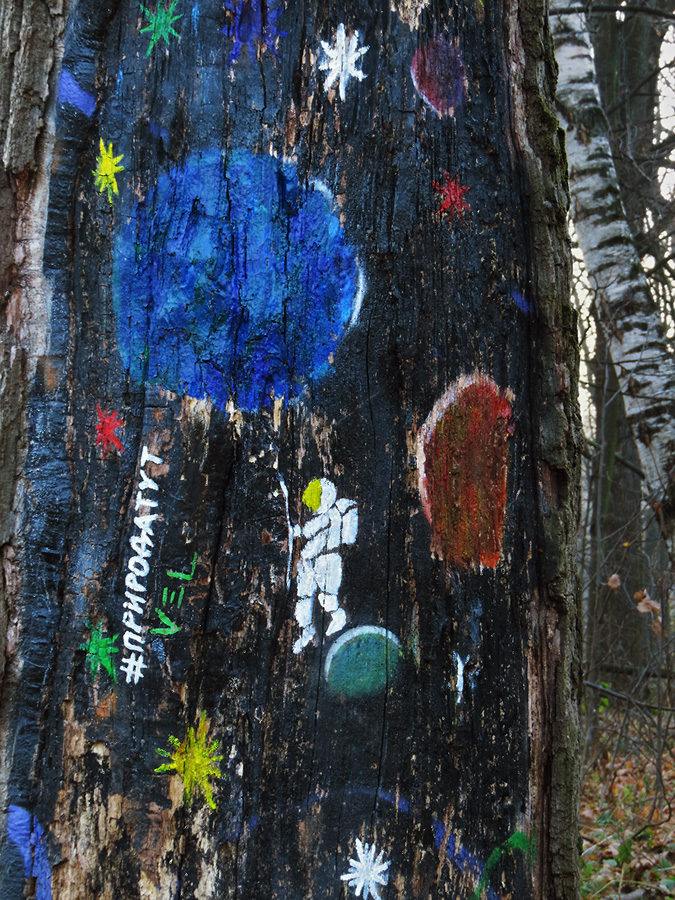 Комментарий. Целый Космос, с его звёздами, планетами и крохотным, но отважным исследователем, уместился на огромном стволе древнего дуба в Терлецком парке.