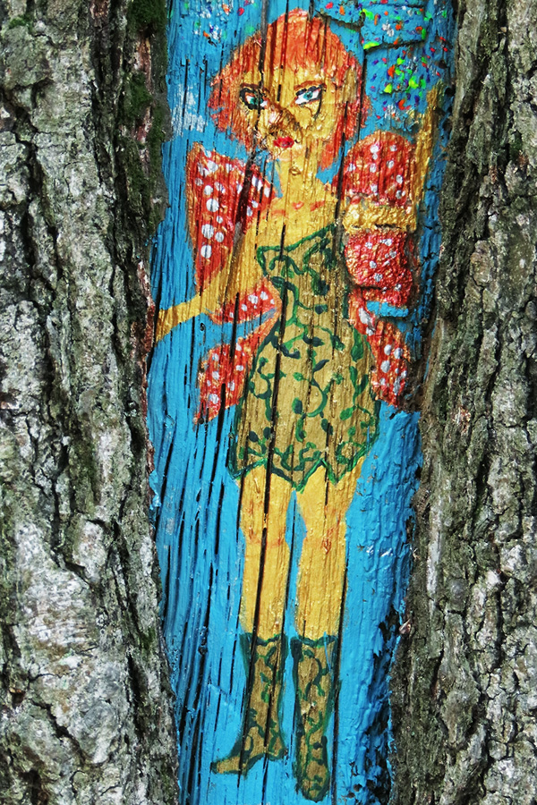 Комментарий. С этого рисунка всё и началось. Бродя по лесным аллеям в Измайловском парке, я вдруг заметил на стволе берёзы яркую картинку: сквозь неровности и трещины старого дерева на нас смотрела маленькая крылатая фея - фантастический персонаж, созданный неизвестным художником. Я сфотографировал милое существо и с тех пор, во время прогулок, искал глазами что-то подобное. Так родилась моя коллекция снимков парковой живописи, ставшая основой данного раздела.
