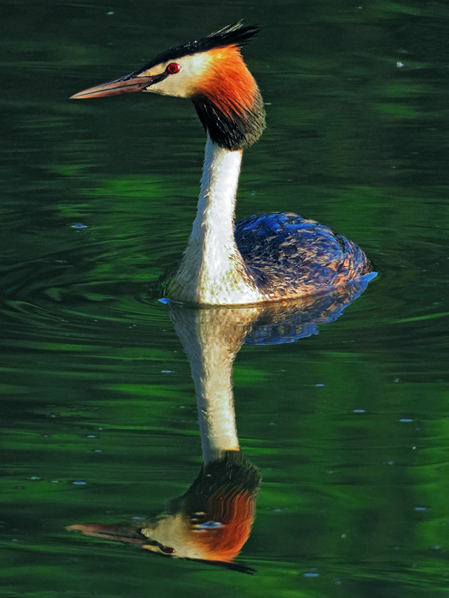 Именно в это время у юго-восточной оконечности пруда охотится за рыбой чомга или большая поганка (Podiceps cristatus).
