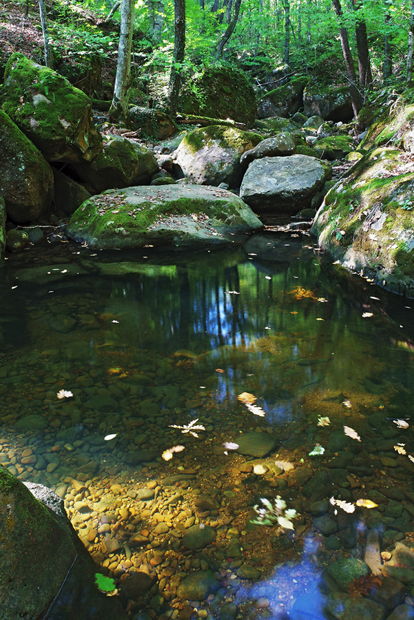 Лето и осень в этих местах - пора затишья. Ерик полностью пересыхает, оставляя после себя лишь небольшие лужицы прозрачной воды с мелкой галькой на дне, куда падают увядшие листья.