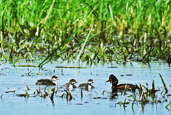 Вот, вдалеке, у зарослей рогоза замечаю: черношейная поганка (Podiceps nigricollis) вывела на "прогулку" троих птенцов.