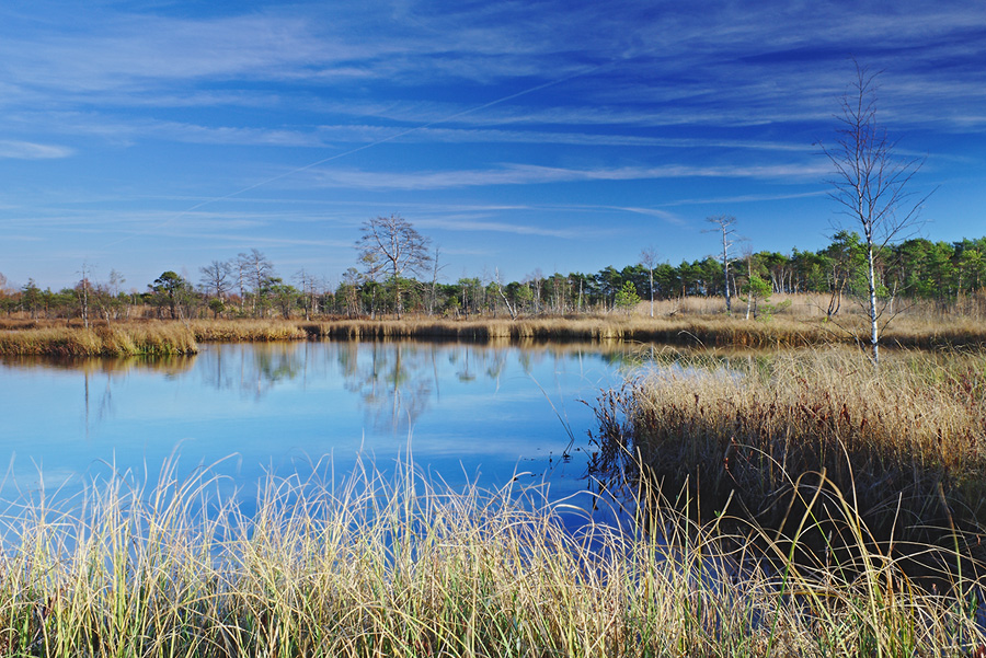 заброшены, и болото постепенно восстанавливается после вмешательства человека. Длинные узкие выемки на месте бывших