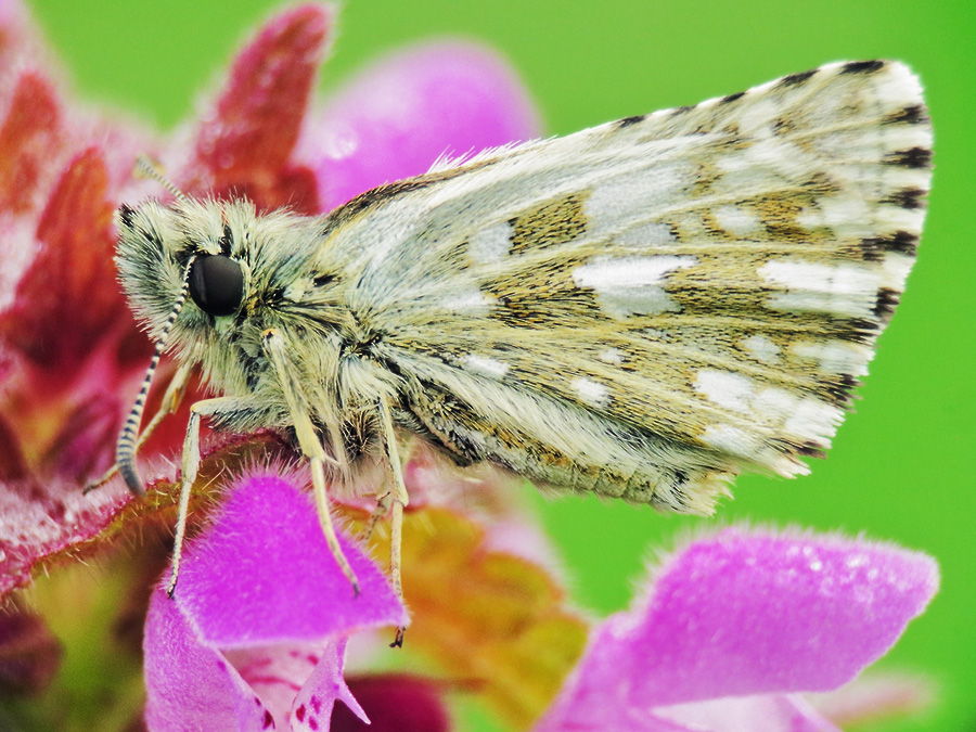 Комментарий. Бабочка толстоголовка альвеус, Pyrgus alveus из семейства толстоголовок (Hesperiidae) на цветущей яснотке пурпурной (Lamium purpureum).