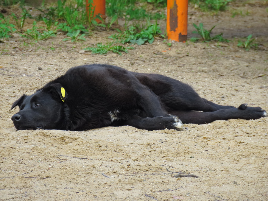 Комментарий. Чёрный пёс, дремлющий на песке детской площадки, которую закрыли на карантин. В его ухе нетрудно разглядеть ярко-жёлтую "серьгу", содержащую электронное следящее устройство.