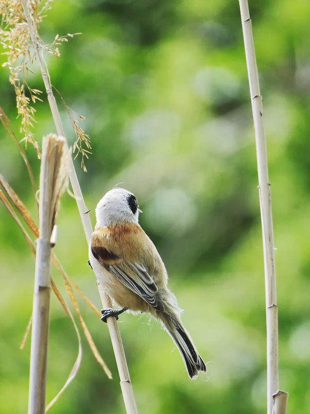 Комментарий. А вот и сам строитель показался на сухом стебле тростника неподалёку от гнезда. Узнать ремеза легко по характерной окраске: рыжевато-бурая спина, чёрно-белые перья на хвосте и крыльях и, конечно же, светло-серая голова с чёрной маской вокруг глаз.