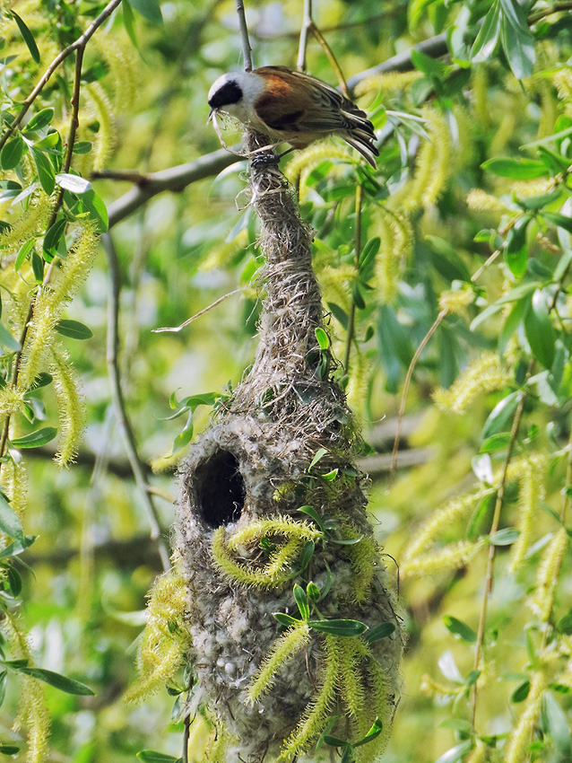Неутомимый самец ремеза вплетает очередную сухую травинку в сложную конструкцию своего архитектурного шедевра.