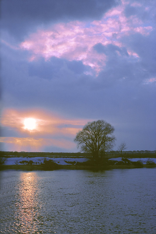Однажды, в пасмурный день, уже ближе к вечеру, по возвращении домой я увидел, как усталое зимнее солнышко всё-таки пробилось из-за туч, засияло нежными лучиками, начертало золотую дорожку на водной глади...
