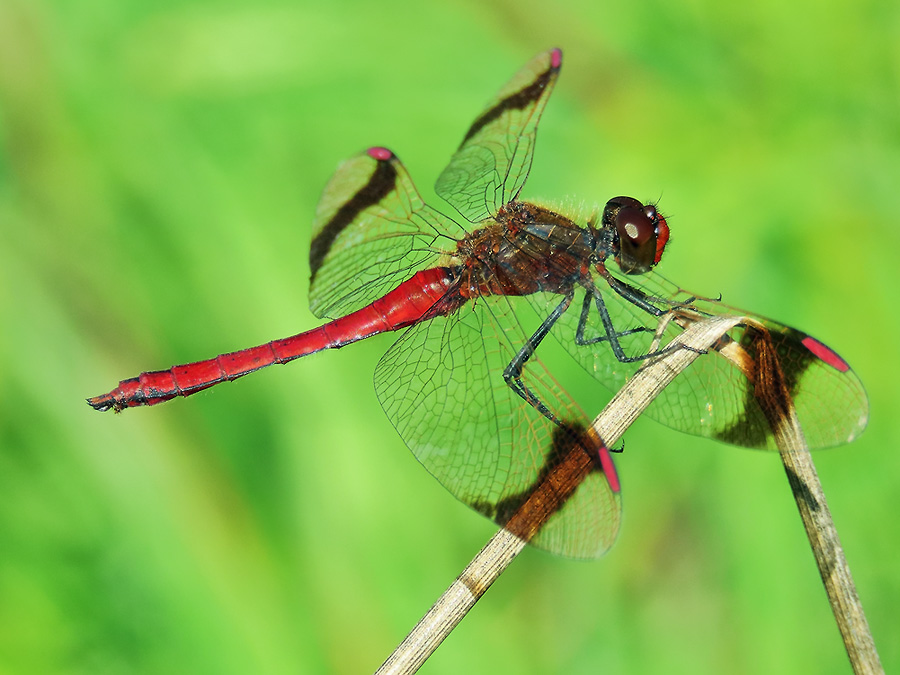 На снимке: ярко окрашенный самец Sympetrum pedemontanum, сидящий на сухой травинке.
