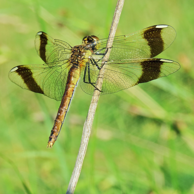 На снимке: самка Sympetrum pedemontanum, окрашенная скромнее самца, но с не менее яркими лентами на крыльях.
