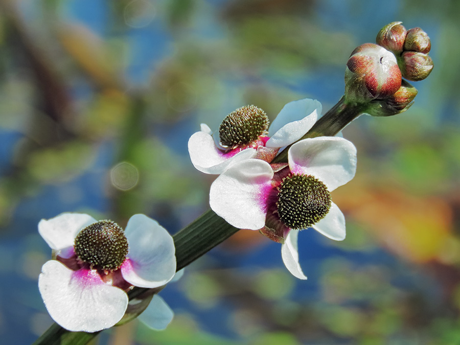Прекрасны и необычны цветки стрелолиста с тремя белыми, с пурпурным основанием, лепестками. Поднимаясь над водной гладью,