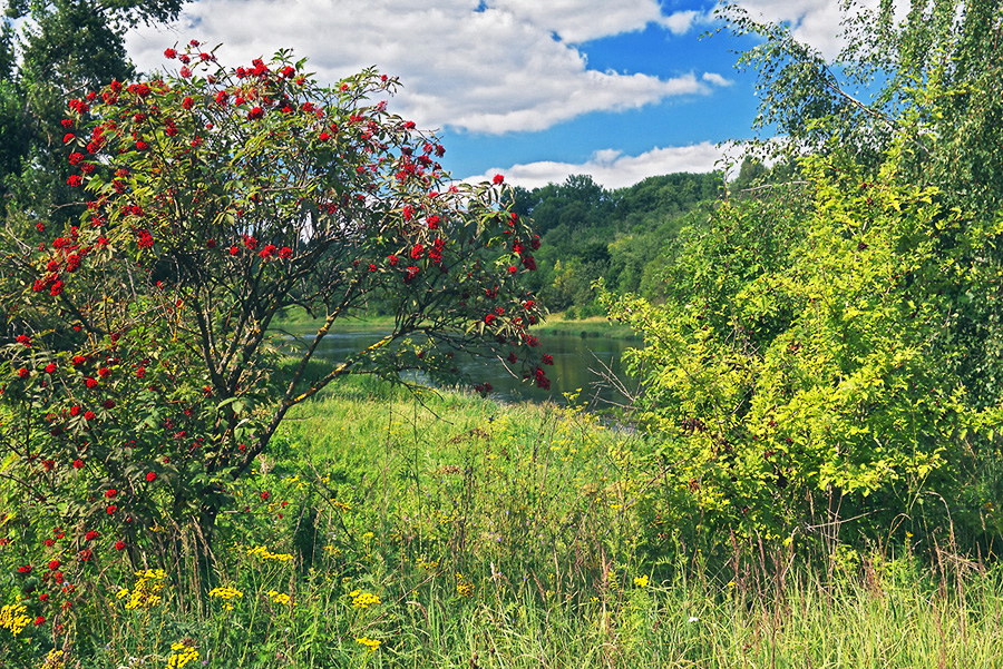 пижмы и сочной зелени трав, я заметил маленькое прекрасное деревце бузины, щедро усыпанное огненно-красными гроздьями