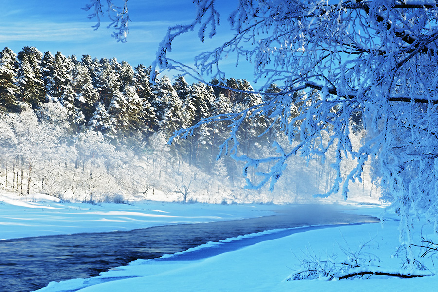 Правый берег всегда остаётся в тени: клубы пара, что поднимаются от незамерзающей стремнины, быстро превращаются в иней,