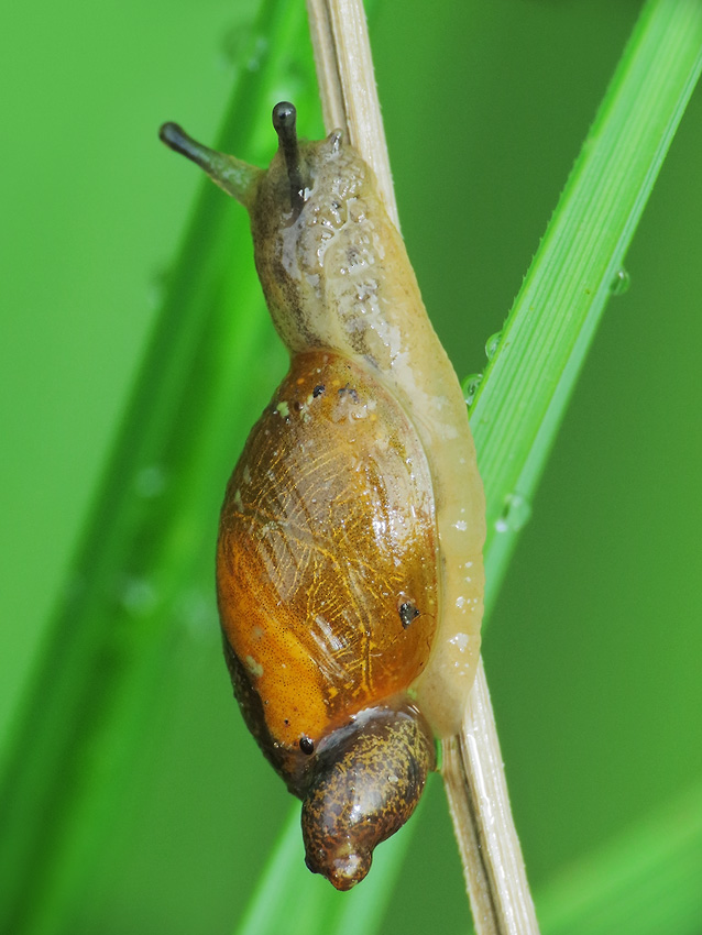 Улитка янтарка обыкновенная (Succinea putris) с необычной формой раковины. Её обороты не прилегают друг к