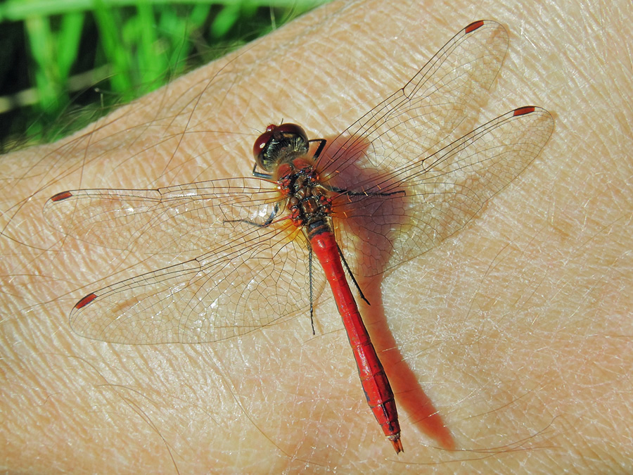 Ярко окрашенный самец стрекозы Sympetrum sanguineum совершенно невозмутимо сел прямо на мою руку и не собирается улетать,