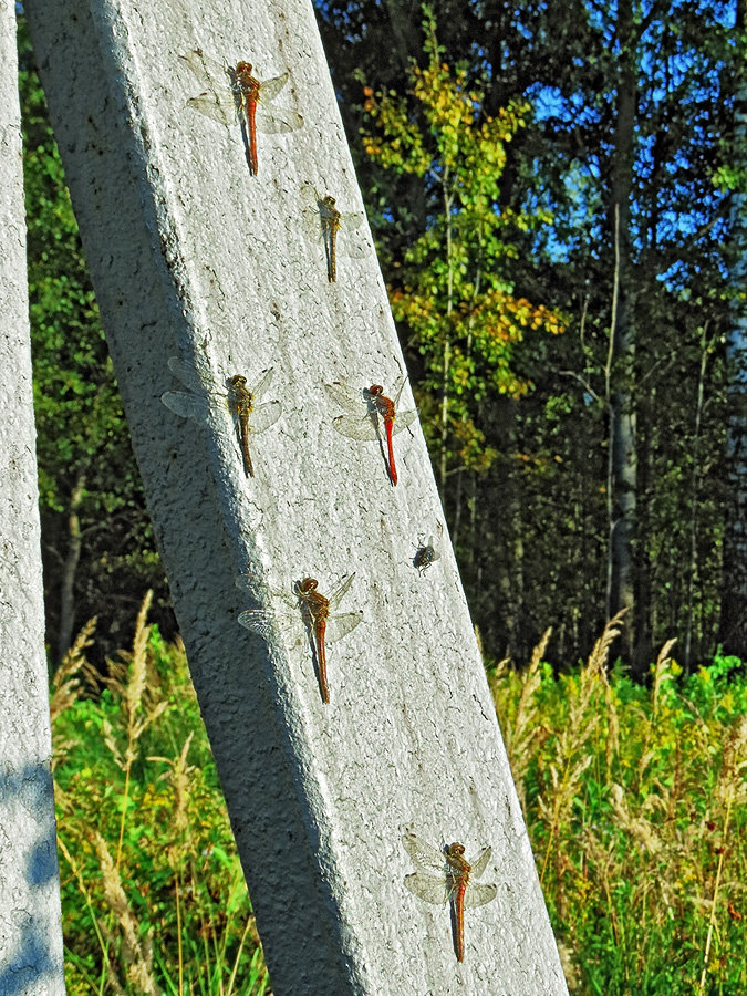 участке уместились шесть представителей рода Sympetrum и совершенно не боящаяся этих хищников муха.