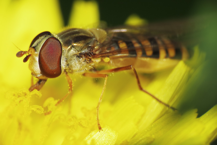 Комментарий. Журчалка Episyrphus balteatus или мармеладная муха лакомится пыльцой на соцветии одуванчика (Taraxacum officinale).