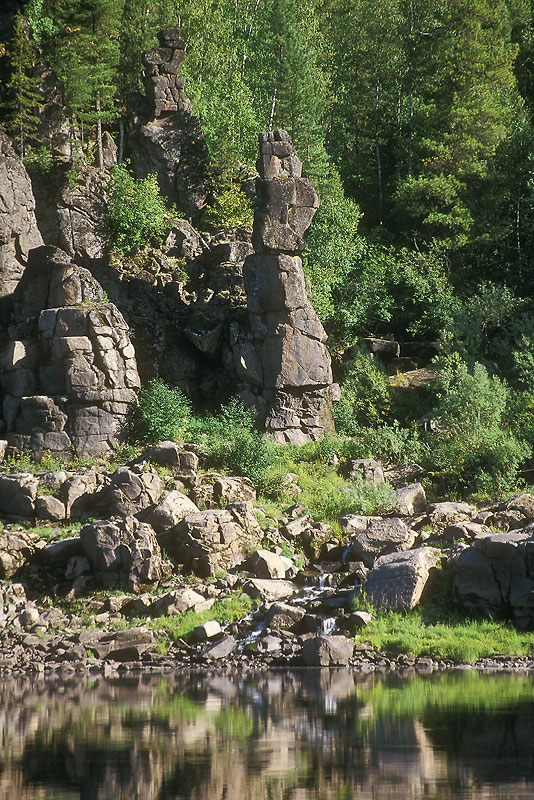 Этот пейзаж открывается взору по левому берегу, где река сильно сужается, зажатая между скал. В очертаниях каменных столбов воображение угадывает черты людей, животных, сказочных персонажей. Смотрите: центральный камень удивительно напоминает Мумми-тролля - маленького сказочного "бегемотика", у которого хорошо видны ушки (или рожки) на голове, глаз, рот, сложенные на животе лапки и даже копытца. Я снимал с противоположного (правого) берега телеобъективом, что позволило приблизить и отчётливо рассмотреть каменные фигуры. Но стоит переплыть реку и подойти вплотную - иллюзия совершенно пропадает.