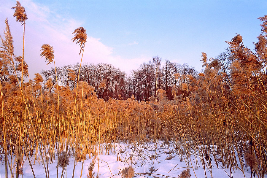 Прекрасны тростниковые заросли в лучах заходящего зимнего солнца, когда они сияют