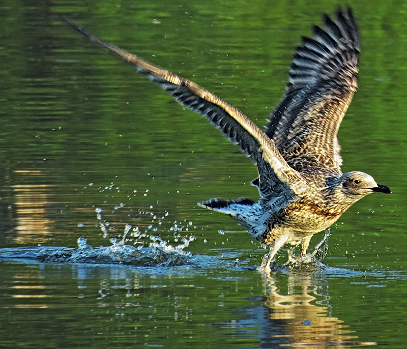 Комментарий. Молодая серебристая чайка (Larus argentatus), взлетающая с поверхности воды в западной части Лебедянского пруда.