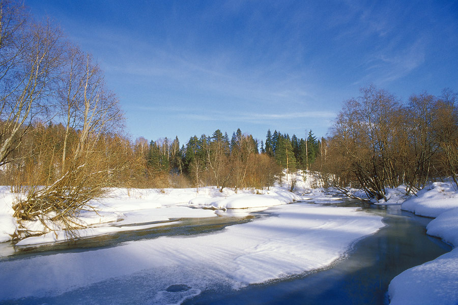 снежные берега. Предчувствуют весну и деревья. Ещё не начинал таять снег, ещё трещат морозы, а тонкие