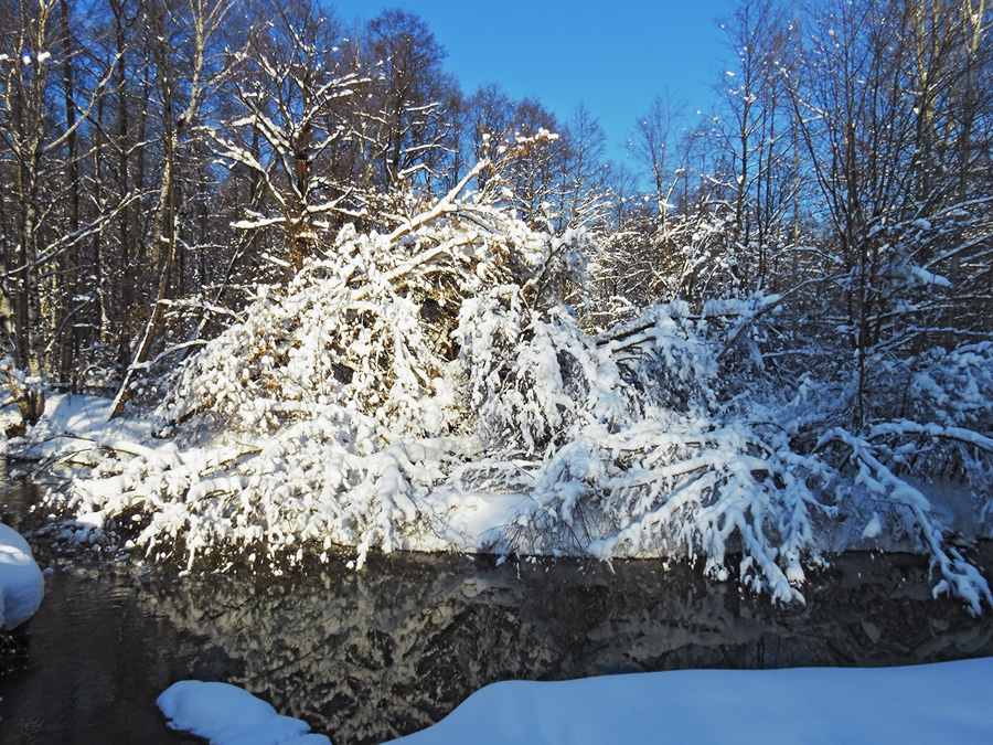 Снежные шубки на ветвях начинают подтаивать, падая вниз, а кое-где - превращаются в искрящиеся полупрозрачные льдинки.